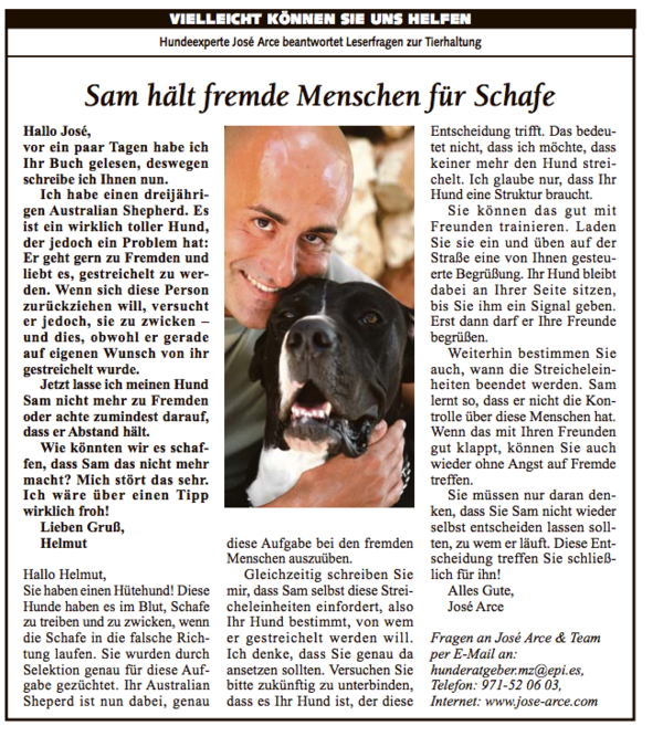 Al principio puedes preparar la situación con amigos. Indícales que en la calle se acerquen a vosotros para saludaros. Haz que Sam se ponga a tu lado y que permanezca sentado durante el saludo y solamente tras una orden tuya le dejas saludar a tu amigo. Después decide tu mismo cuando tienen que acabar las caricias. Sam así notará que no es él el que toma el control de las personas. Cuando esto funcione con gente de confianza puedes ir avanzando poco a poco con desconocidos.